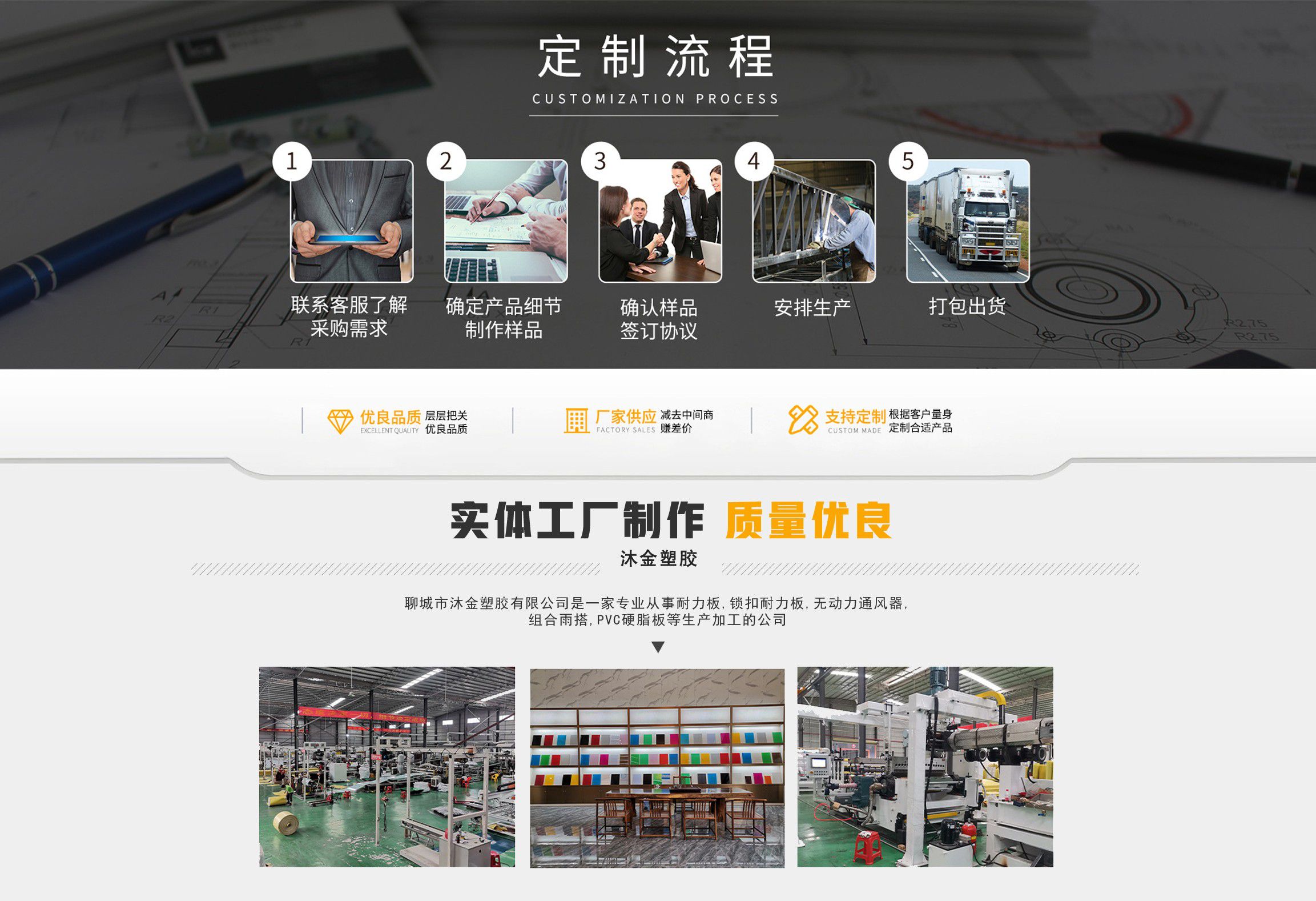 聊城市沐金塑膠有限公司注冊資金2180萬元,占地20000余平方,擁有自建廠房15000平方,員工100余名。10余年來,公司主營耐力板,鎖扣耐力板,耐力板深加工,無動力通風(fēng)器,組合雨搭,PVC硬脂板,耐力板廠家等板材的發(fā)展戰(zhàn)略,逐漸成長為綜合性企業(yè)。 公司擁有多條板材共擠生產(chǎn)線,采用世界知名品牌進(jìn)口原材料和先進(jìn)工藝,依據(jù)完善的ISO9001質(zhì)量管理體系和ISO14001環(huán)境管理體系,為產(chǎn)品的卓越品質(zhì)提供了強(qiáng)有力的保證。憑借過硬的創(chuàng)新能力和堅實(shí)的硬件基礎(chǔ),贏創(chuàng)已成為國內(nèi)領(lǐng)先的熱塑性板材生產(chǎn)商,產(chǎn)品被廣泛應(yīng)用于建筑業(yè)、農(nóng)業(yè)、工業(yè)、廣告業(yè)、安防行業(yè)及DIY領(lǐng)域。 公司始終致力于通過提供最優(yōu)的板材應(yīng)用解決方案,為客戶創(chuàng)造最高的價值;堅守創(chuàng)新、質(zhì)量、靈活、服務(wù)和速度的核心價值觀;堅持“完美的產(chǎn)品需要完美服務(wù)的支持”的經(jīng)營理念,努力實(shí)現(xiàn)成為世界領(lǐng)先的板材與解決方案供應(yīng)商的夢想。 在未來,公司將立足客戶需求,不斷改變和完善現(xiàn)有產(chǎn)品,拓展產(chǎn)品線和充分開發(fā)板材的應(yīng)用領(lǐng)域,為客戶創(chuàng)造全方位的價值。同時更好地實(shí)現(xiàn)員工的價值,實(shí)現(xiàn)公司團(tuán)隊的價值。我們將與您一起創(chuàng)贏未來! 企業(yè)使命:成為世界領(lǐng)先的板材與解決方案供應(yīng)商。 公司愿景:通過提供最優(yōu)的板材應(yīng)用解決方案,為客戶創(chuàng)造最高的價值。 核心價值觀:質(zhì)量...